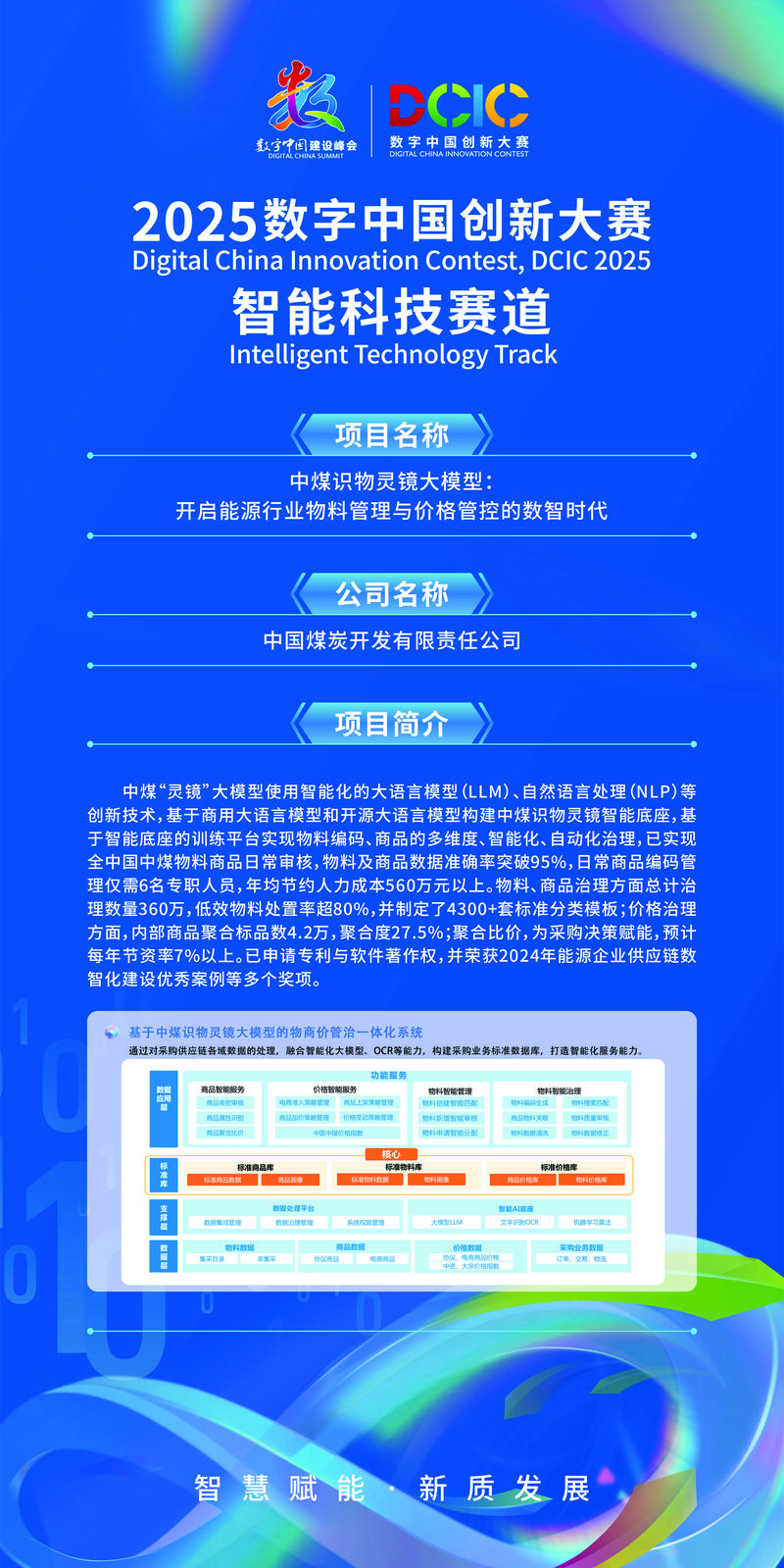 在2025數(shù)字中國創(chuàng)新大賽智能科技賽道中,中國中煤能源集團(tuán)有限公司自主研發(fā)的“中煤靈鏡供應(yīng)鏈大模型”憑借其在能源行業(yè)智能化場景中的突破性應(yīng)用與技術(shù)創(chuàng)新,成功晉級全國總決賽。此次大賽以“以賽促研、以賽促用、以賽育人”為宗旨,吸引了全國超千支隊(duì)伍、2400余名創(chuàng)新人才參與,最終行業(yè)大模型賽道60支隊(duì)伍入圍總決賽。中煤靈鏡大模型作為能源領(lǐng)域代表,展現(xiàn)了AI技術(shù)與傳統(tǒng)產(chǎn)業(yè)深度融合的前沿探索。