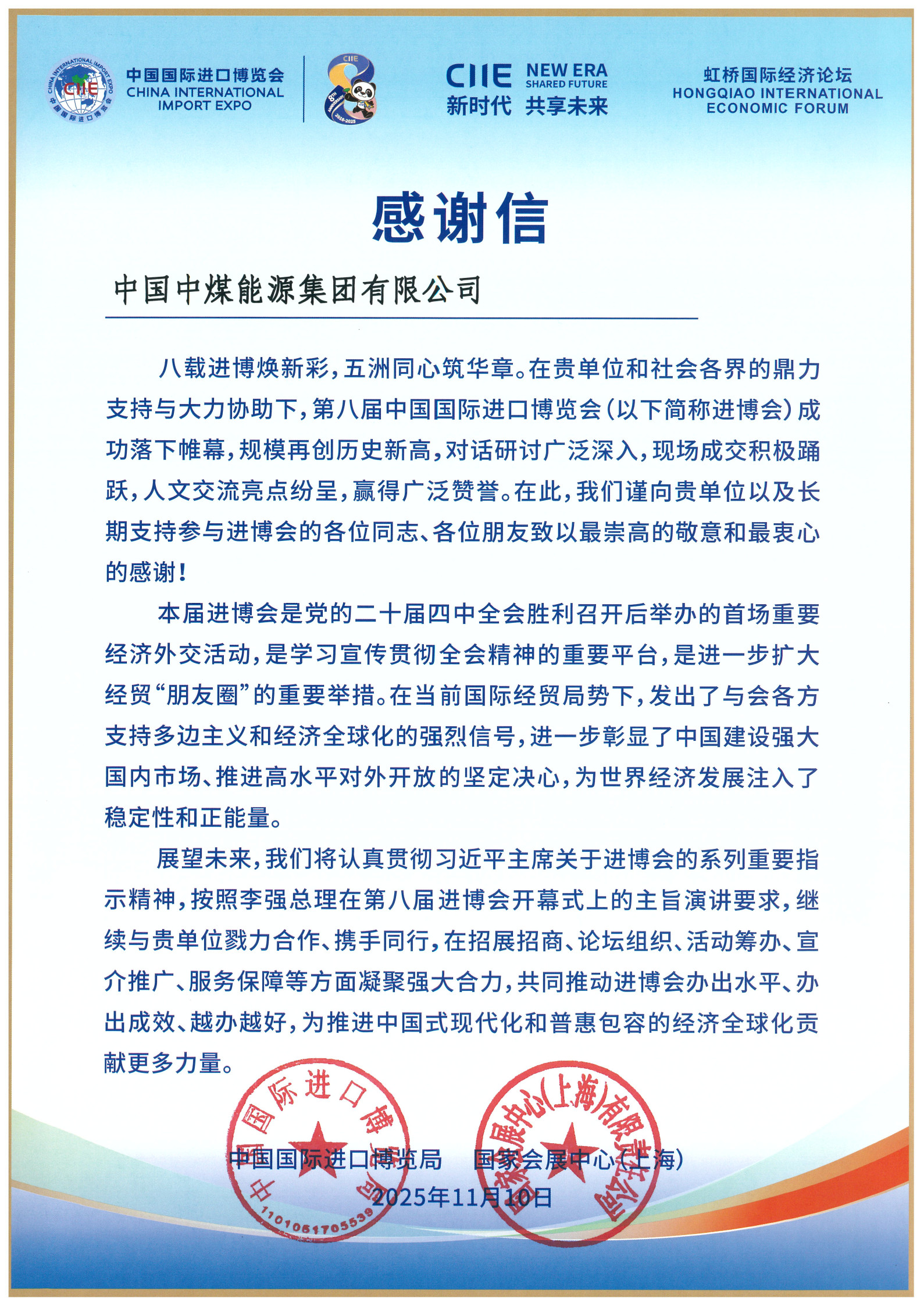 中國(guó)國(guó)際進(jìn)口博覽局感謝信
