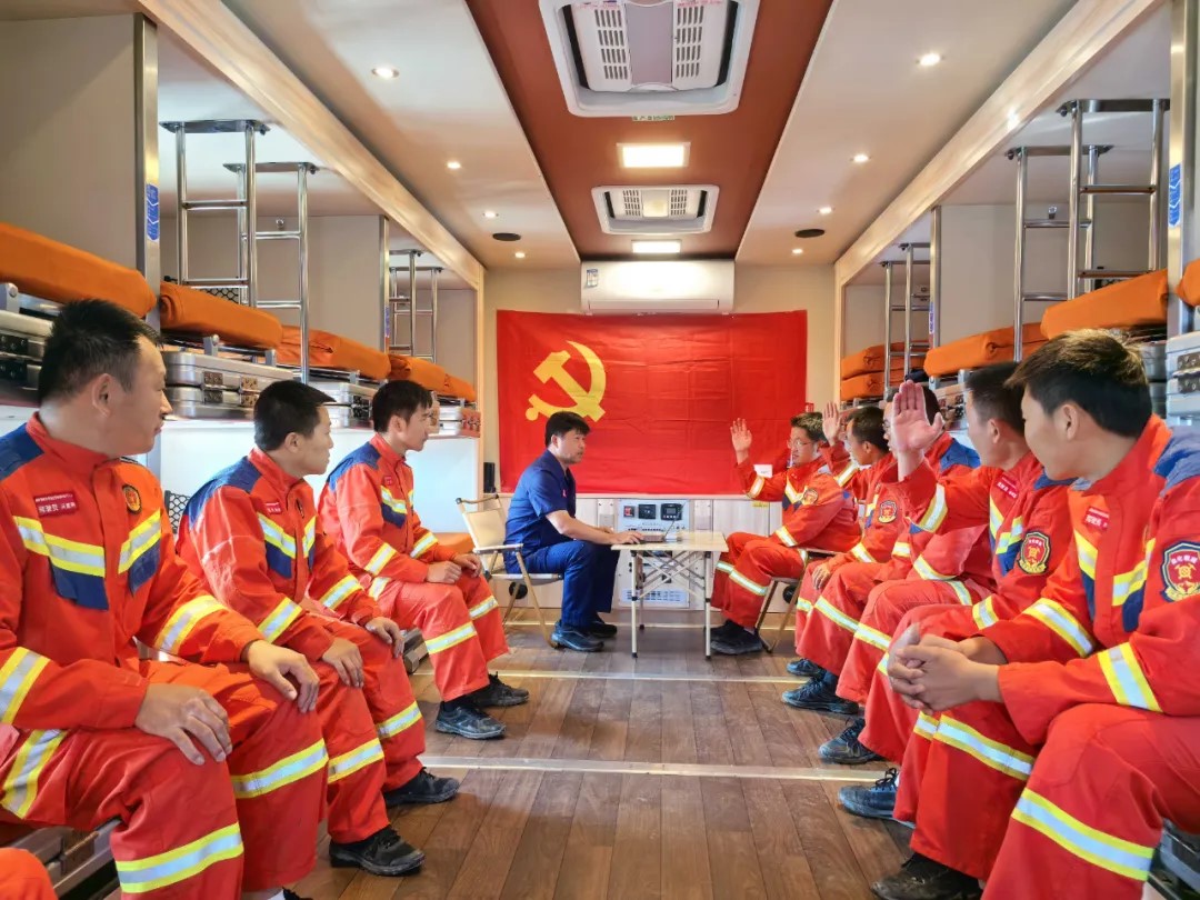 現(xiàn)場(chǎng)情況比預(yù)想更為復(fù)雜。一片汪洋,水下雜物遍布,搶險(xiǎn)時(shí)間緊迫。中煤榆林隊(duì)布置好排澇陣地后,立即召開(kāi)臨時(shí)黨支部成立后的第一次會(huì)議。狹小的車(chē)廂里,13名指戰(zhàn)員圍坐在一起,黨旗莊嚴(yán)地貼在車(chē)門(mén)內(nèi)側(cè),映照著每一張堅(jiān)毅的面孔。